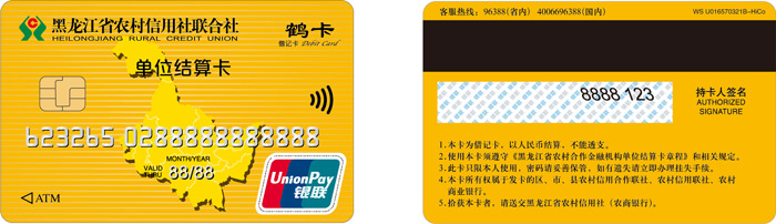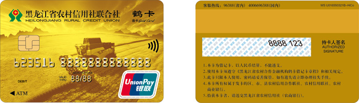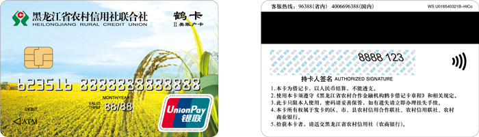 简介:鹤卡(借记卡)是黑龙江省农村信用社银行卡借记卡的统一品牌,是面向社会公开发行的银联标准卡。该卡以“一卡多账户、一卡多功能”为特点,集定、活期存款账户于一体;具有存取现金、转账结算、消费、理财、中间业务等多方面功能;可以作为贷款、粮食直补、代理业务的账户;可以跨行、跨地区、跨境在有“银联”标识的ATM机和POS机上凭密码使用,安全可靠,方便快捷;可以作为农民工卡在开办了农民工银行卡特色服务的金融机构柜台取款;也可以在开办了农信银业务的其他省农村信用社网点的柜台办理存取款、查询、转账等业务。目前鹤卡(借记卡)产品目前有19种,卡种有:普卡、金卡、单位结算卡、独立品牌卡、村镇银行卡、二类户卡等;联名卡卡种有:社保卡、残联卡、大庆工会联名卡;特色卡卡种有:丰收时代卡、粮食收购卡、惠民一卡通等。
